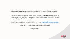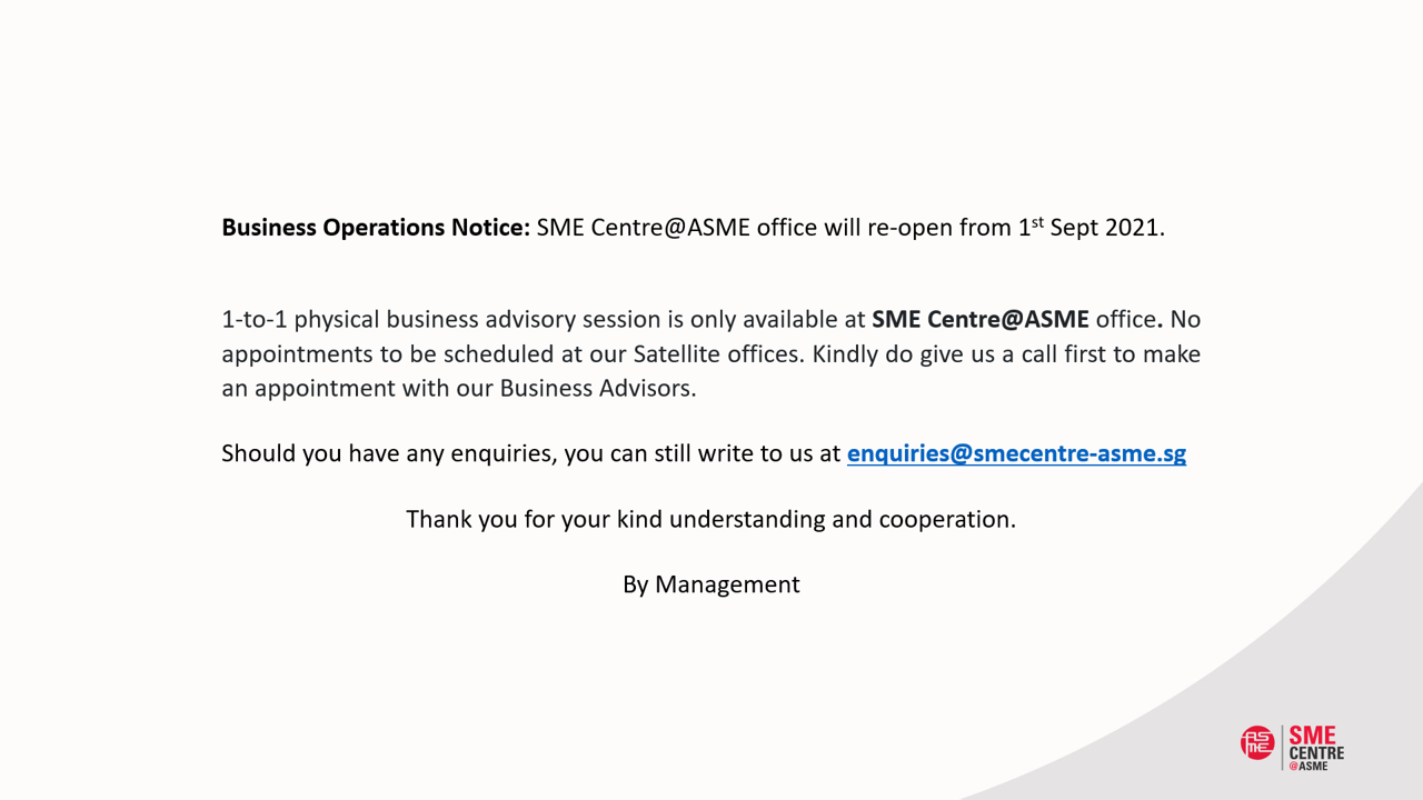 Physical business advisory session is only available at SME Centre@ASME. No appointments to be scheduled at our Satellite offices.